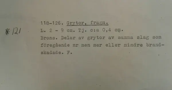 M 17000 och M 17001-serien sammanhör och är samtidigt förvärv 1960-12-10 (Dnr 883/60 ATA). Föremålen hade då katalogiserats i fyndförteckningen. Inskriven i huvudboken år 1962.