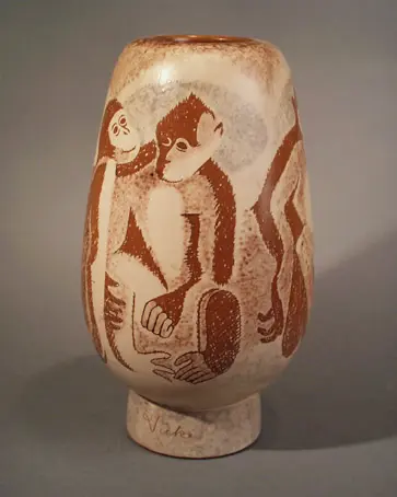 Vas av Vicke Lindstrand. Han var konstnärlig ledare 1942-50 på Upsala-Ekeby. Vasen finns i Ekebys katalog 1944.