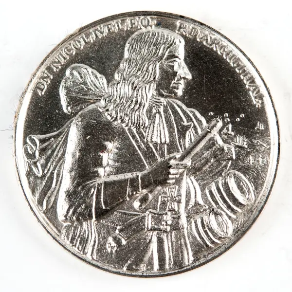 Denna stora och tunga medalj designades av Christofer Schneider, en medaljör som arbetade i Köpenhamn under 1600-talets sista fjärdedel. Han producerade också en mycket större version av denna medalj, som vägde 49 uns (!), vilket är en av de största medaljerna som någonsin slagits.