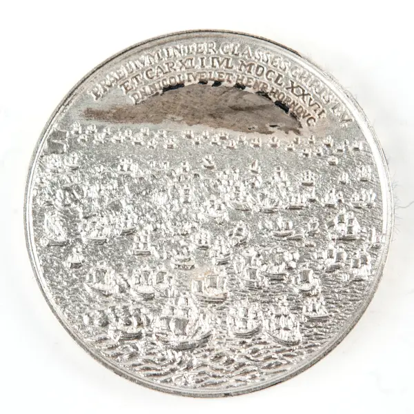 Själva striden stod mellan den kombinerade danska och holländska flottan, under ledning av den berömde holländska amiralen Cornelis Tromp, och den svenska flottan under baron Lorentz Creutz. På pappret hade svenskarna en mycket kraftfullare flotta: deras flaggskepp, Stora Cronan (The Grand Crown), var vid den tiden det största krigsfartyget i världen (126 kanoner och en besättning på 850 man). Svenskarna fastnade dock i lä och när deras flaggskepp sökte svänga lät hennes öppna kanonportar havet komma in och hon kapsejsade och exploderade sedan när krutförråden fattade eld. I slutet av striden var svenskarna besegrade. Det bör noteras att även om medaljen anger datumet 1 juli 1677 för slaget, ägde det faktiskt rum den 1 juni 1676! När det gäller Skånska kriget (1675-1679) ställde det Sverige och i viss mån Frankrike mot de förenade styrkorna från Nederländerna, Danmark och Brandenburg. Svenskarna förlorade till sjöss och på land mot brandenburgarna, men besegrade den danska armén. Till slut ledde den svenske kungen Karl XI:s äktenskap med en dansk prinsessa (Ulrika Eleonora), och andra komplexa förhandlingar, till att praktiskt taget ingenting förändrades av kriget. Källa: en.numista.com
