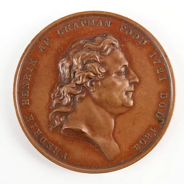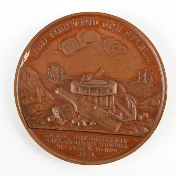 Ur Bror Emil Hildebrands "Sveriges och svenska konungahusets minnespenningar, praktmynt och belöningsmedaljer", andra delen, s 467: " Hundra års festen firades, i närvarao af sällskapets Hederspraeses H.K.H. Hertigen af Östergötland Prins Oscar, i Carlskrona på Konungens födelsedag d. 3 Maj 1872, ehuru den egentlia hundra års dagen efter sällskapets stiftelse var d. 15 Nov. 1871.... Som aktningsgärd åt sällskapets Hedersledamot, den Svenska krigsflottans snillrike omdanare, Vice Amiralen af Chapman, insattes hans bild på sällskapets jubelmedalj. Frånsidan är efterbildad sällskapets i Konung Gustaf III:s tid slagna jettoner."