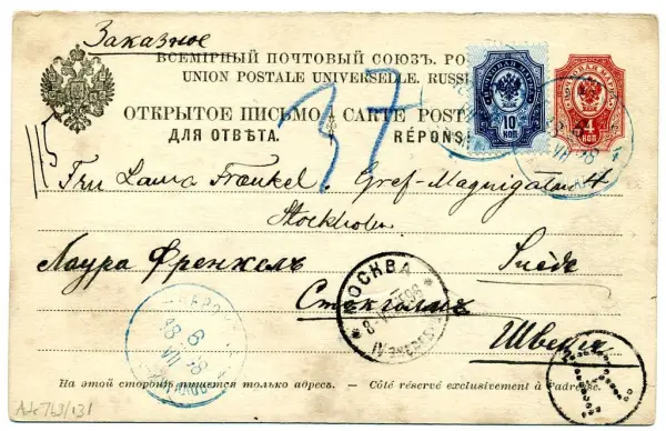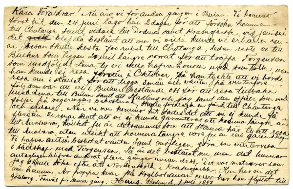 - Brevkort från Hans Frænkel till hans mamma Laura. Han befinner sig i Ryssland som deltagare i Expedition Andrée Recherche. Skriver om sina funderingar kring resrutten framöver.