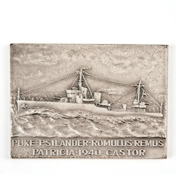 - Av kungl. maj:t präglad till minne av hemförendet av de i Italien köpta jagarna 1940. Varje man tilldelades en plakett med vederbörandes namn ingraverat samt en skrivelse lydande: Till mnne av hemförandet till Sverige av de i i Italien inköpta fyra jagarna Puke, Psilander, Romulus och Remus samt såsom ett uttryck för Svenska Statens erkänsla till den däri deltagande personalen för under påfrestande förhållanden fullgjort arbete i Fosterlandets tjänst har jag härmed tillfredställelsen överlämna det för Edre avsedda exemplaret av den plakett, som jämlikt Kungl. Mat:ts beslut den 10 januari 1941 härför präglats. Stockholms slott den 15 januari 1941. På nådig befallning. Per Edvin Sköld/ M. Giron