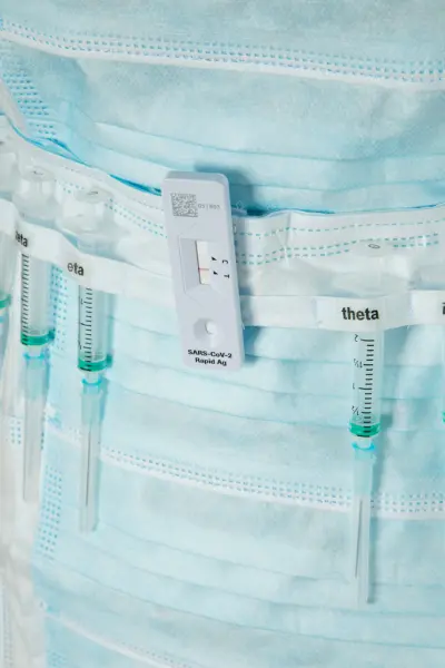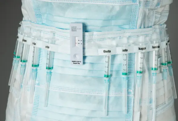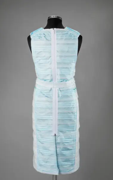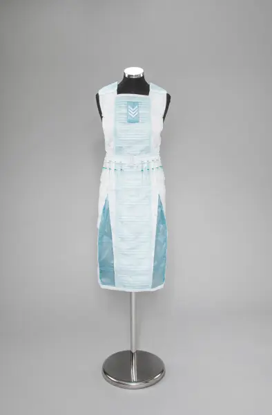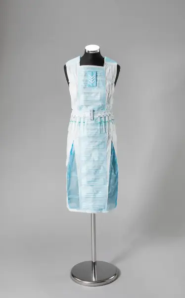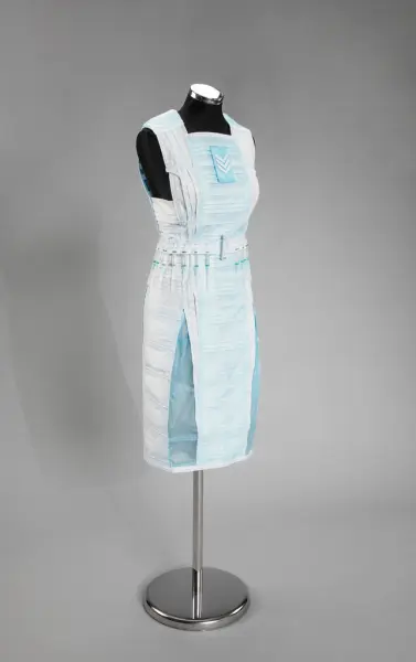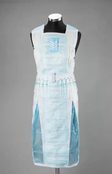- Nasjonalt Medisinsk Museum har anskaffet et tekstilkunstverk kalt «Til tjeneste» laget av kunstner Marit Røed under pandemien. Røed lager kostymer av utradisjonelle materialer, som emballasje og (her) munnbind. Tanken bak kunstverket var å rette oppmerksomheten mot, som Røed sa, «alle de som modig stod i første linje i møte med pasientene». Kjolen vises på koronavirusveggen til Liv og død.