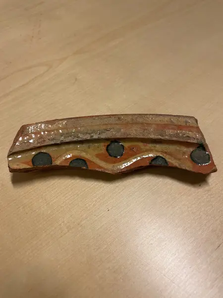 - Fynd vid jordschaktning för ny väg fram till Hammarö kyrka. Fynden påträffade bland lämmningar av en förut okänd husgrund, belägen ca 20-25 m inåt (norrut ) den nya kyrkvägen, räknat från den gamla kyrkvägen ungefär såsom nedanstående planskiss visar. Fynden från 1600-talet.