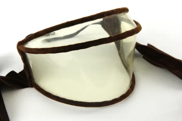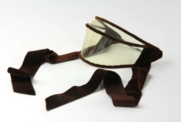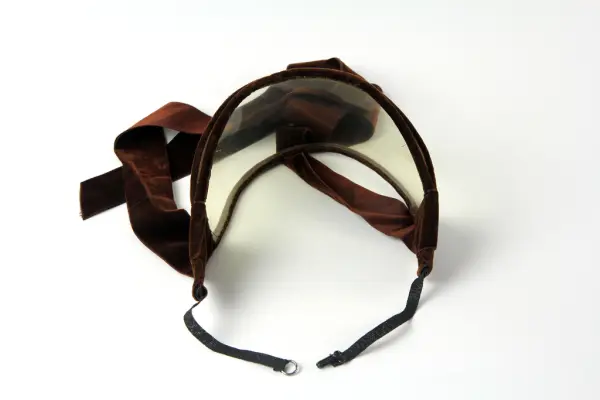 Bilglasögon (skärm) använda av fru Elsa Lindberg (född Boklund). Enligt uppgift använda vid färd färd i öppen bil i slutet av 1910-talet - 1919-1920. Inköpta i Malmö eller Köpenhamn. Bars med blå chiffongslöja om hatten.