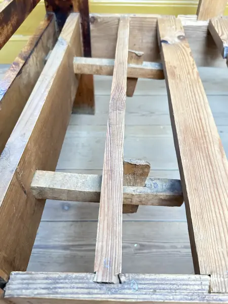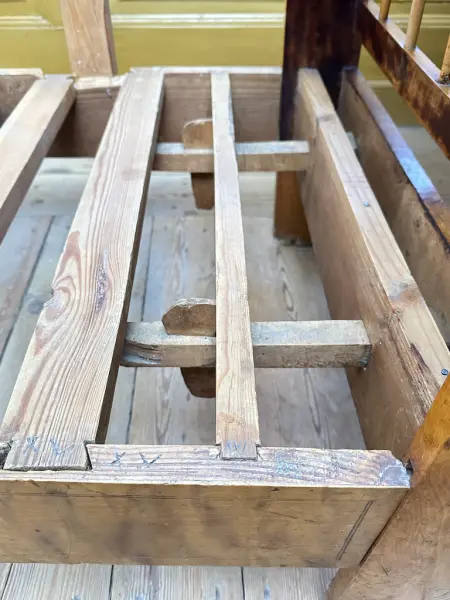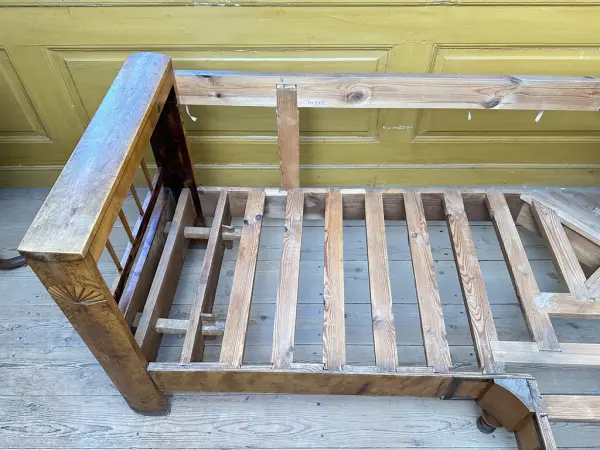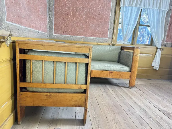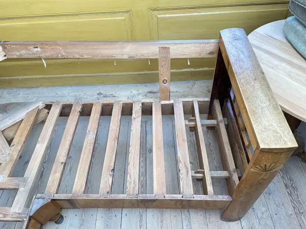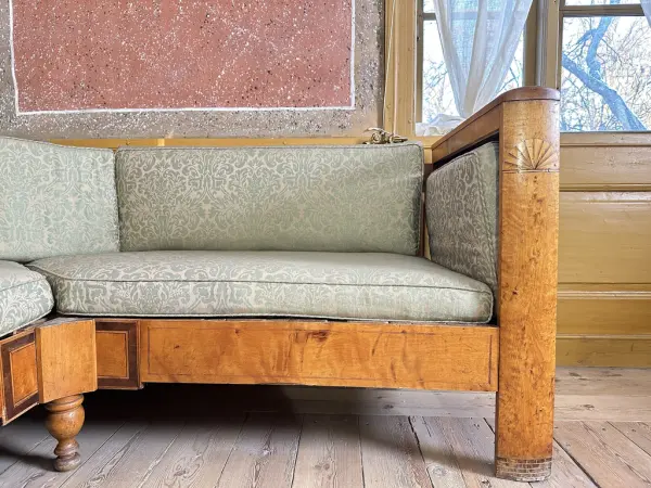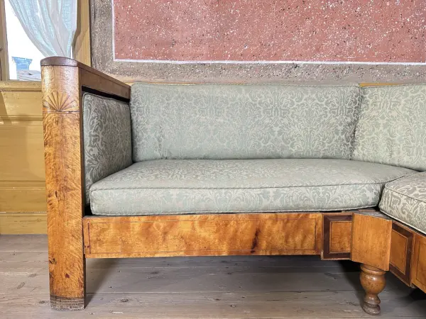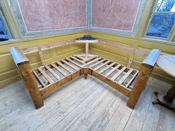 Hörnsoffa i polerad björk med stoppad sits. Genombrutna gavlar med två tvärslåar och spjälor däremellan. Intarsia på gavlarnas kortsidor i form av solfjäderlik halvcirkel samt små ...