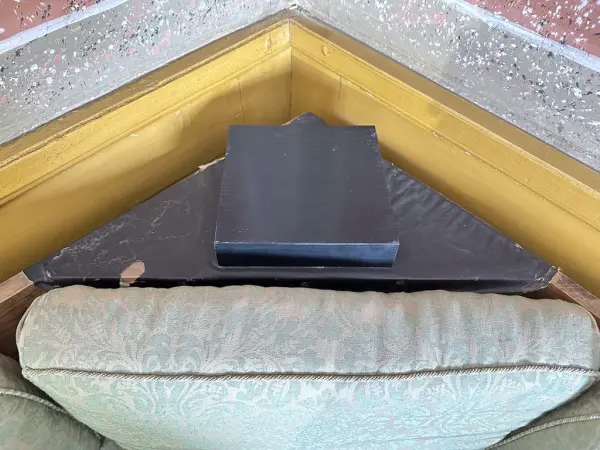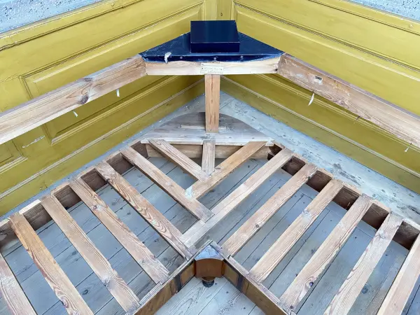 Hörnsoffa i polerad björk med stoppad sits. Genombrutna gavlar med två tvärslåar och spjälor däremellan. Intarsia på gavlarnas kortsidor i form av solfjäderlik halvcirkel samt små rektangulära tegelformade detaljer nederst. Framsargen dekorerad med tunn inläggning i mörkare färg. I hörnets framkant ett svarvat lågt balusterben och något högre sarg med kraftigare inläggning. Ryggen bestående av en sarg baktill med en stödbräda per sida samt en i hörnet. Hörnet klätt i skinnliknande textil och med upphöjd kvadrat i mörkt trä (senare tillkommen). Ribbotten. Sitsar och ryggdynor klädda i lätt glansigt tyg med blomsterornamentik i grön och beige. Kantsnodd i samma kulörer. Baksida i juteväv.