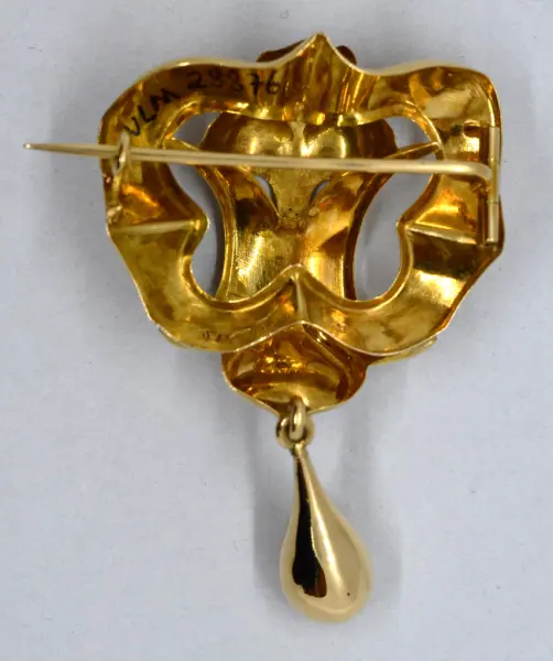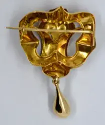 Guldbrosch med veckade former. Graverade dekorer i form av slingrande mönster. Ett droppformat hänge nedtill.