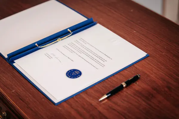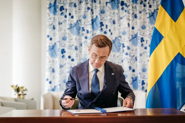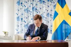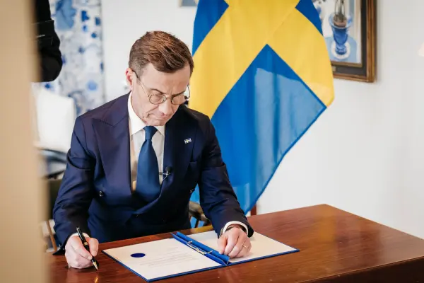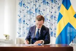 Med hjälp av pennan tog Sverige det sista steget från militär alliansfrihet till medlem av Nato. Anslutningsdokumenten signerades den 7 mars 2024 av statsminister Ulf Kristersson på svenska ambassaden i Washington D.C. Därefter överlämnades dokumenten samma dag till USA:s utrikesminister Antony Blinken i samband med en presskonferens på utrikesdepartementet i huvudstaden.