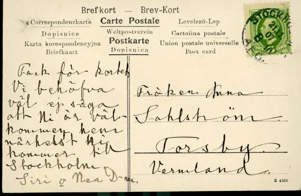 Vykort från Siri Derkert skickat till Anna Sahlström