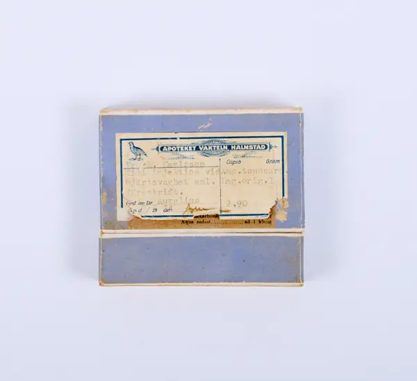 Läkemedel Tonocard, som bland annat användes i samband med förlossningar. Enligt receptet skrevs läkemedlet ut till barnmorskan Martina Carlsson (f.Kristensson) 1875-1945.