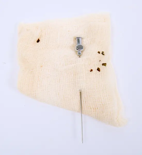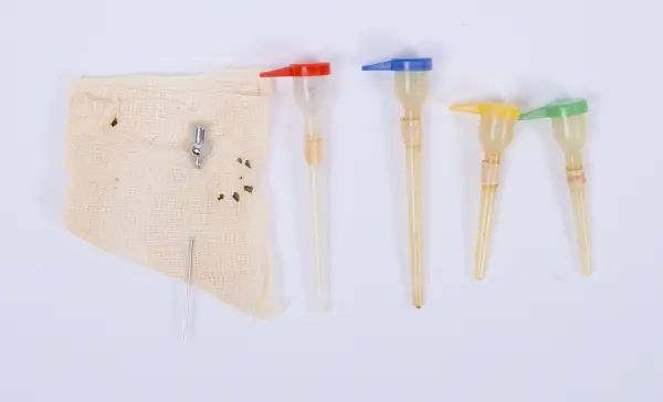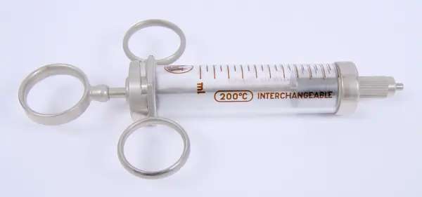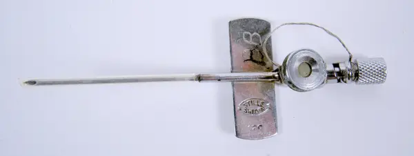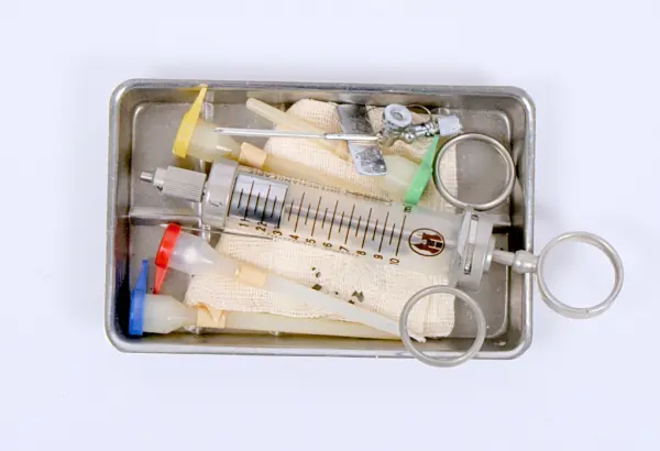 Samling med spruta, infart och nålar som troligen har använts av barnmorskan Martina Karlsson (f.Kristensson) 1875-1945.