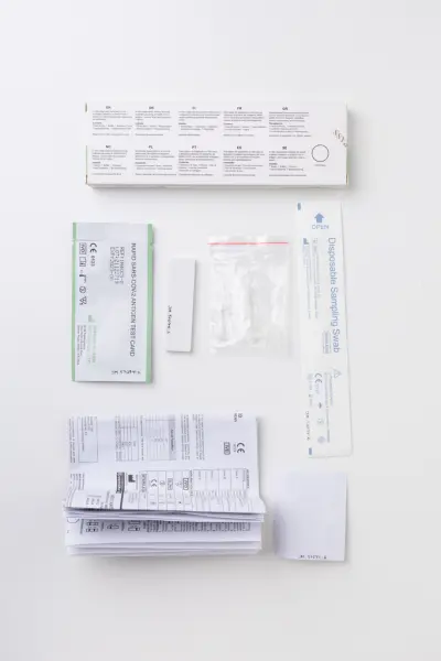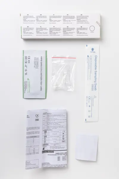 Provtagningskit, Bosons CE-godkända COVID-19 Antigentest, ett självtest för att visa pågående infektion av Covid-19. Gåva av Patricia Monroy, Jönköping 2024.