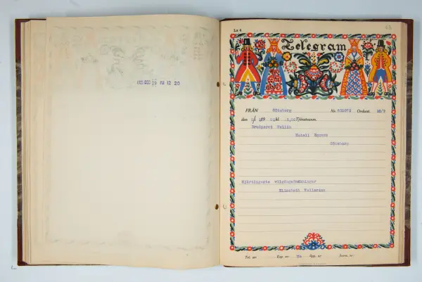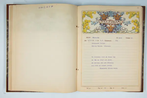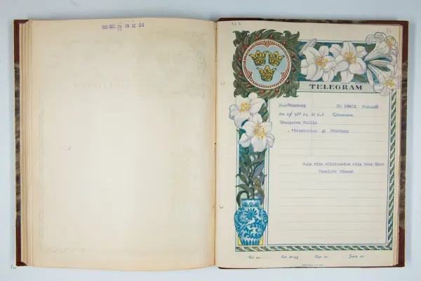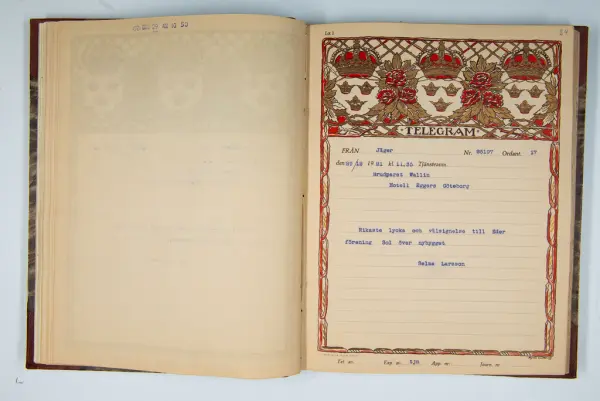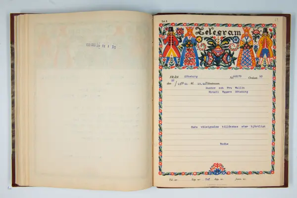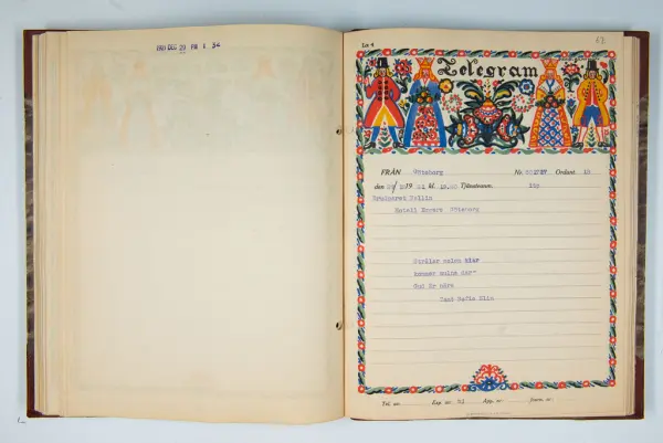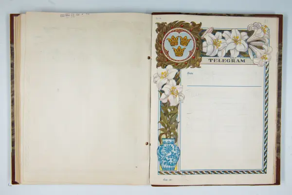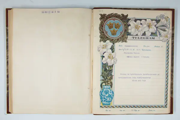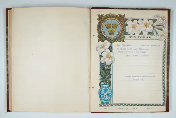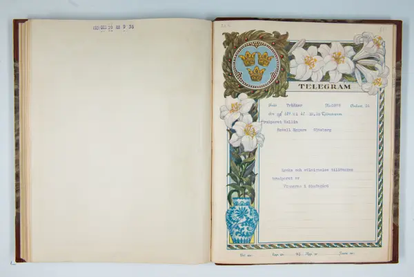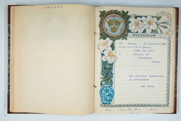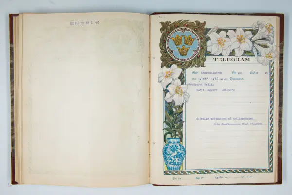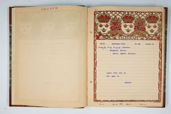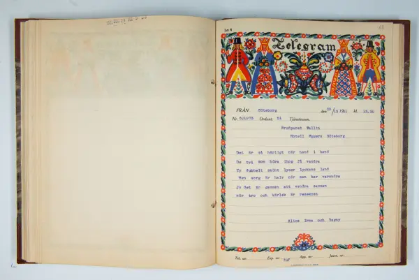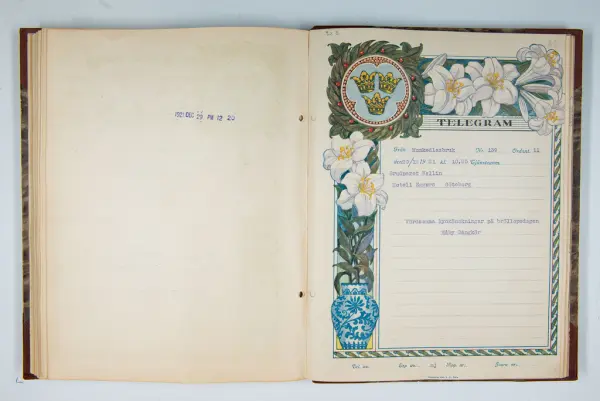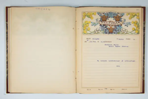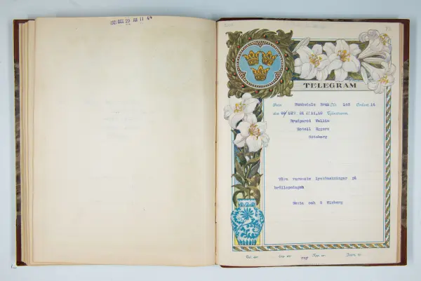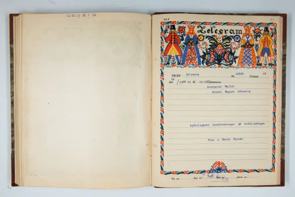Det inbundna albumet innehåller de originaltelegram som skickades till givarens morfars och mormors bröllop 1921 och som lästes upp på middagen på Hotell Eggers i Göteborg, 96 telegram allt som allt med blyertsnumreringar som troligen anger i vilken ordning de lästes upp.