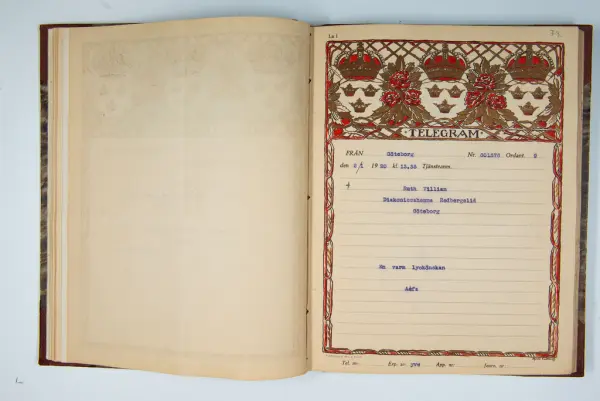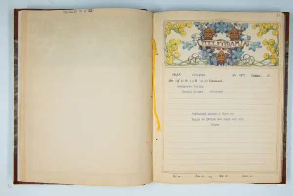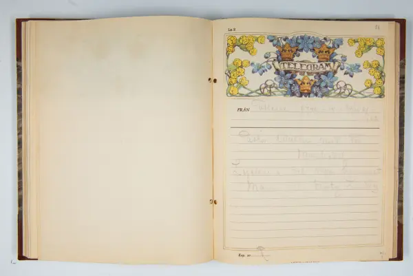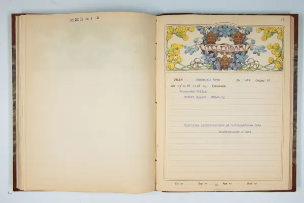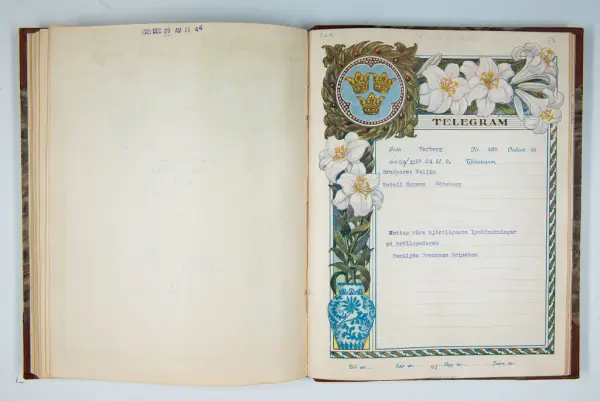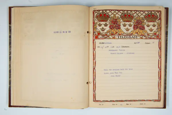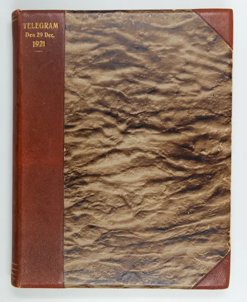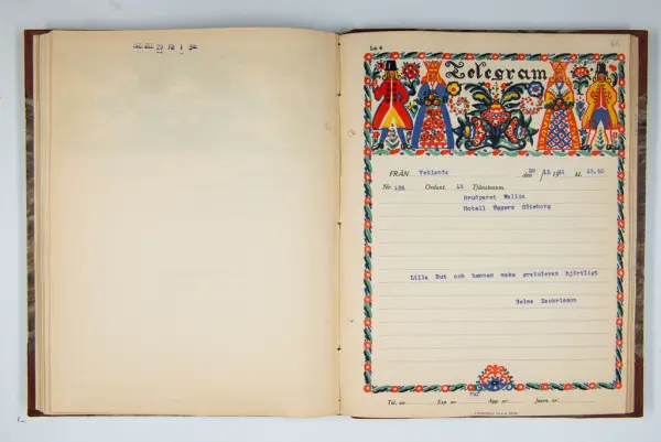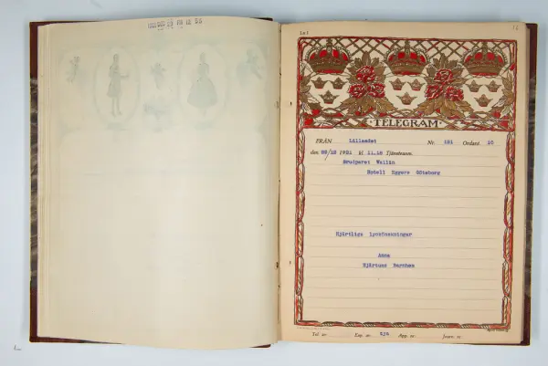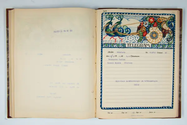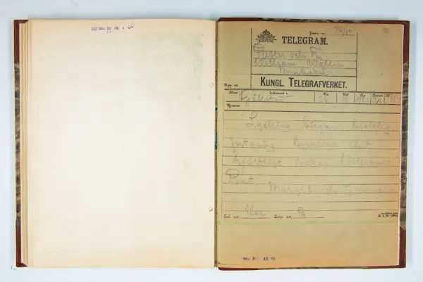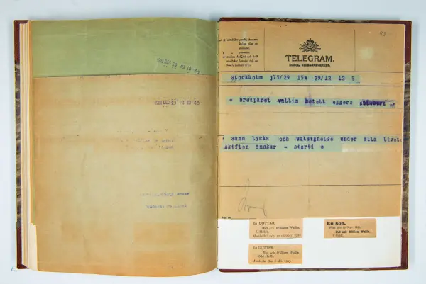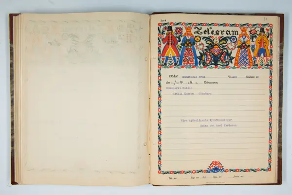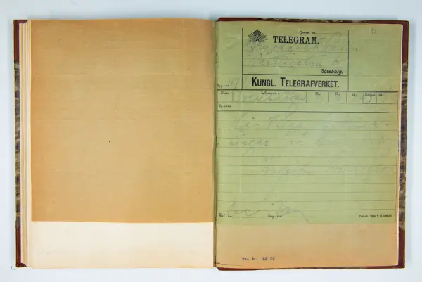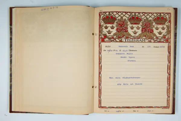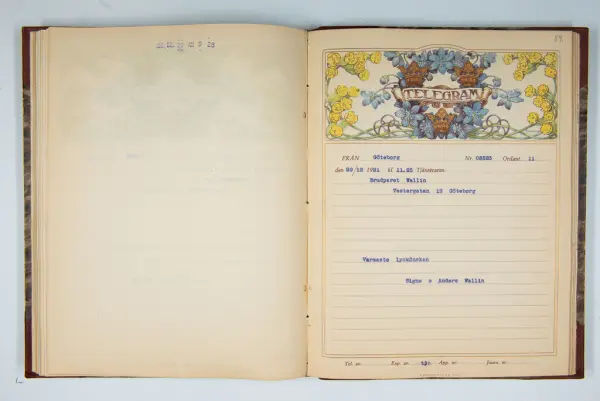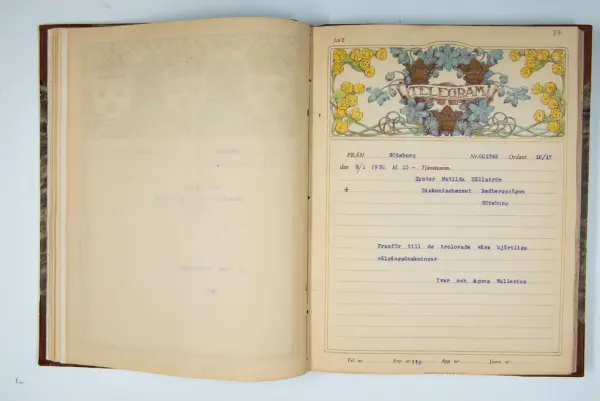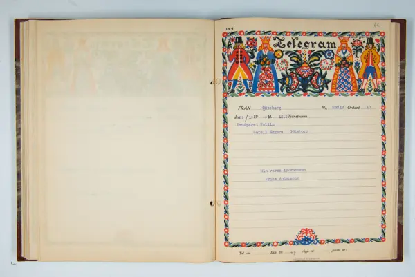 Det inbundna albumet innehåller de originaltelegram som skickades till givarens morfars och mormors bröllop 1921 och som lästes upp på middagen på Hotell Eggers i Göteborg, 96 telegram allt som allt med blyertsnumreringar som troligen anger i vilken ordning de lästes upp.