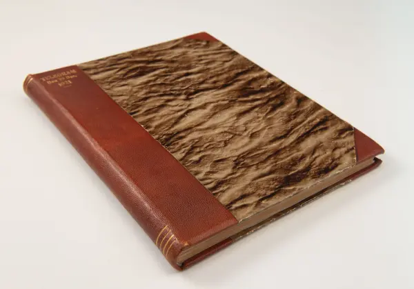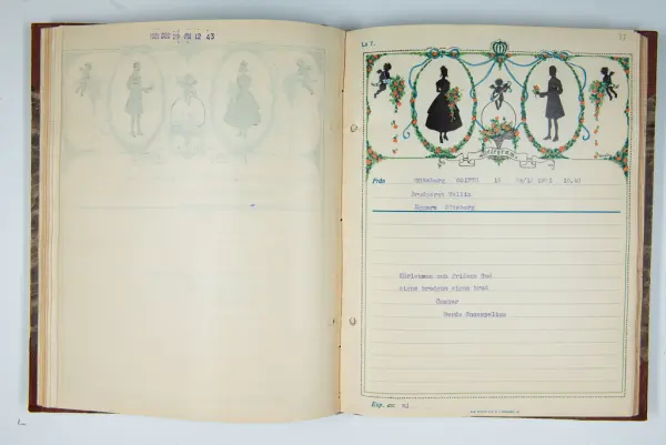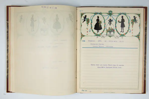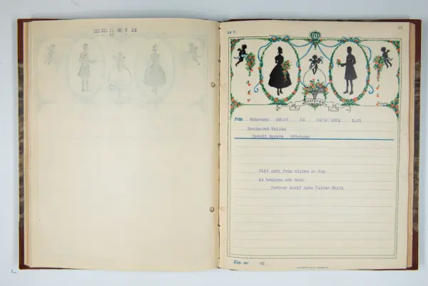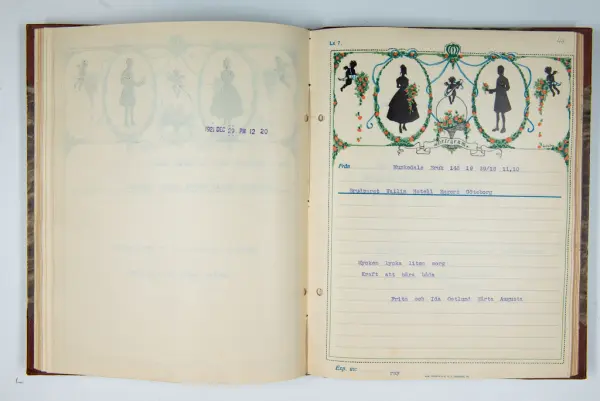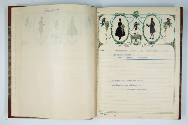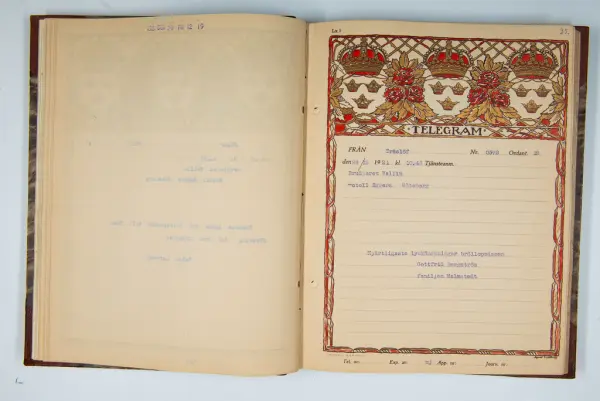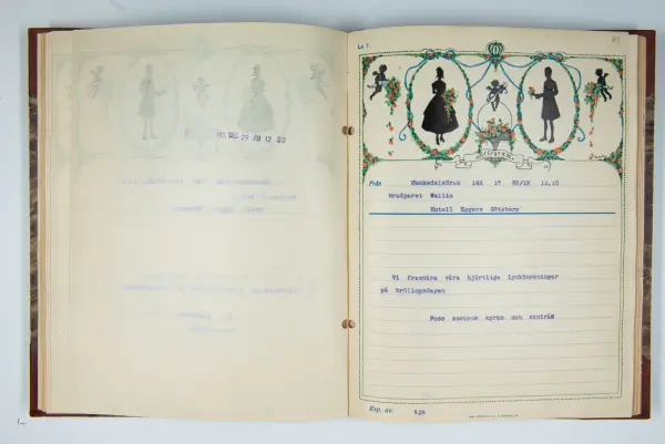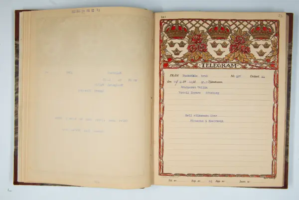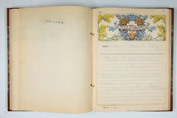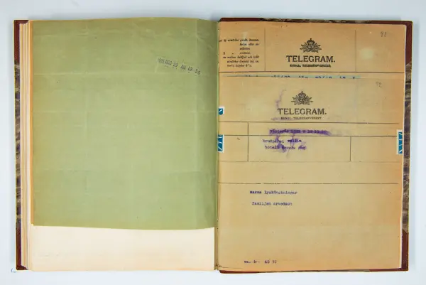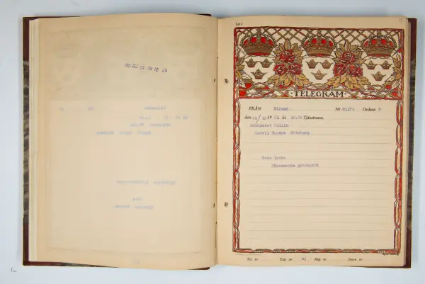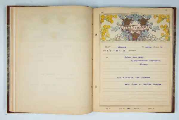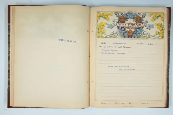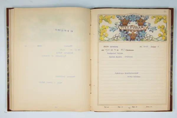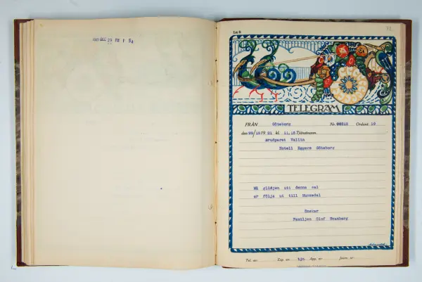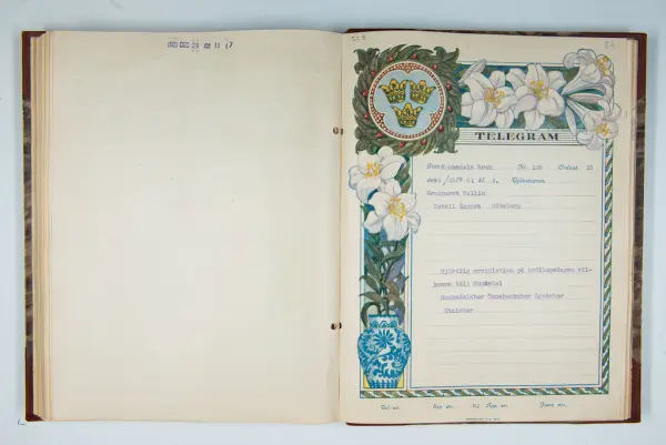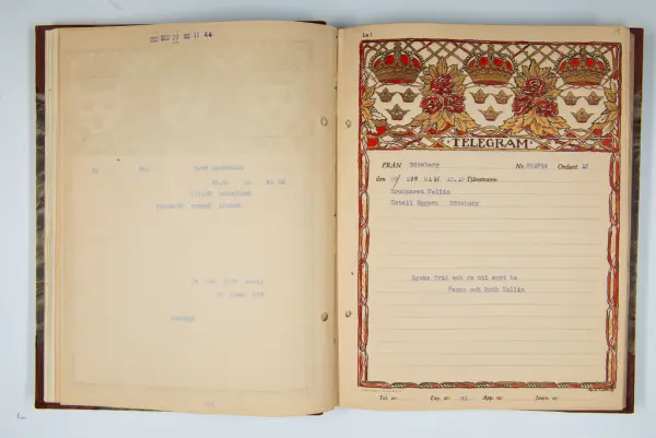 Det inbundna albumet innehåller de originaltelegram som skickades till givarens morfars och mormors bröllop 1921 och som lästes upp på middagen på Hotell Eggers i Göteborg, 96 telegram allt som allt med blyertsnumreringar som troligen anger i vilken ordning de lästes upp.