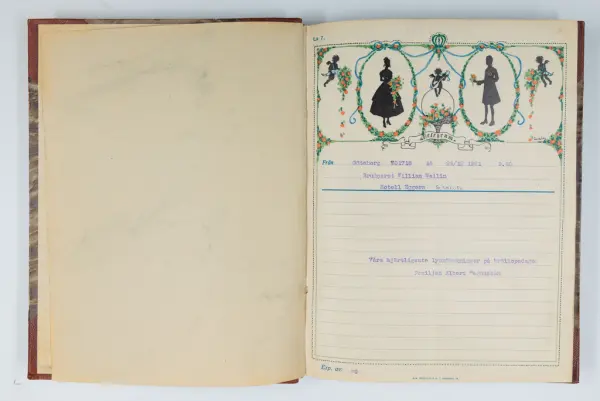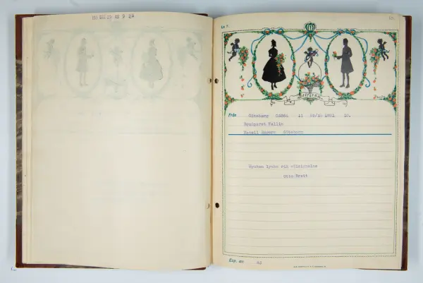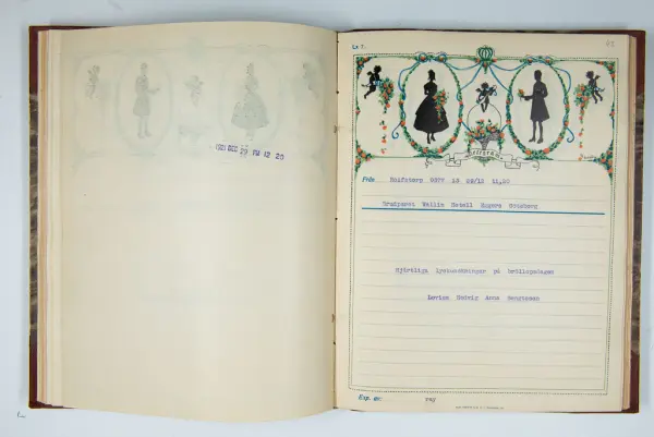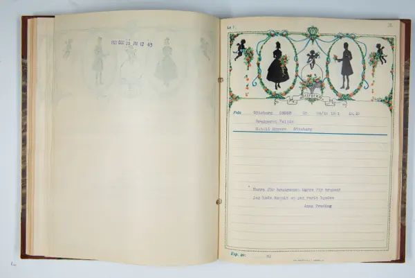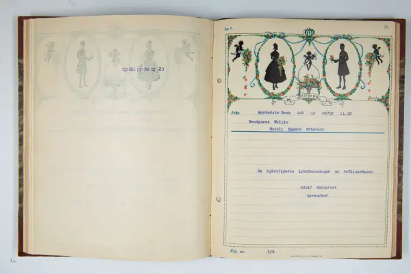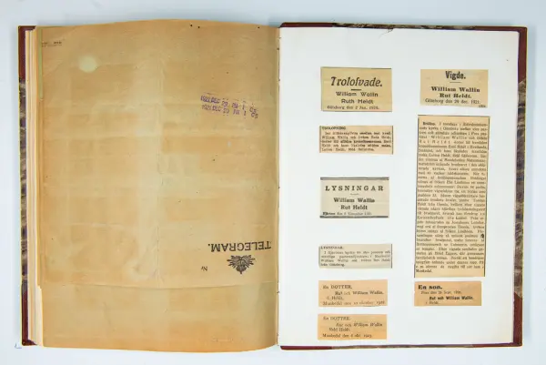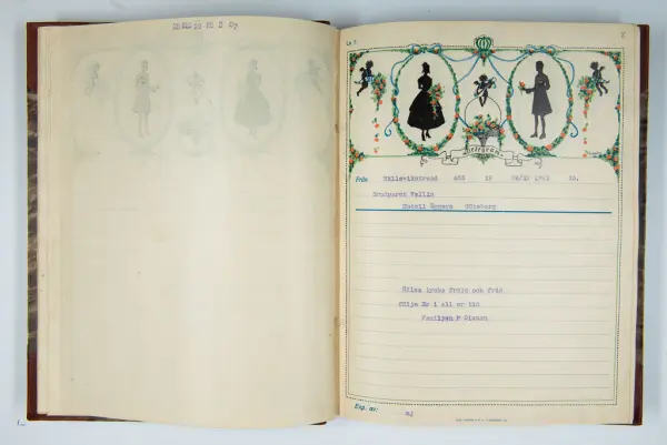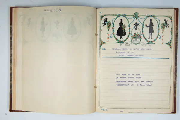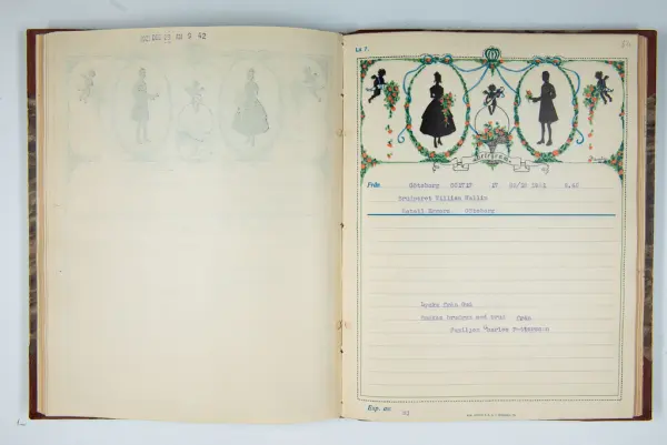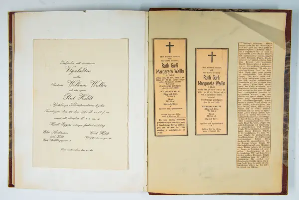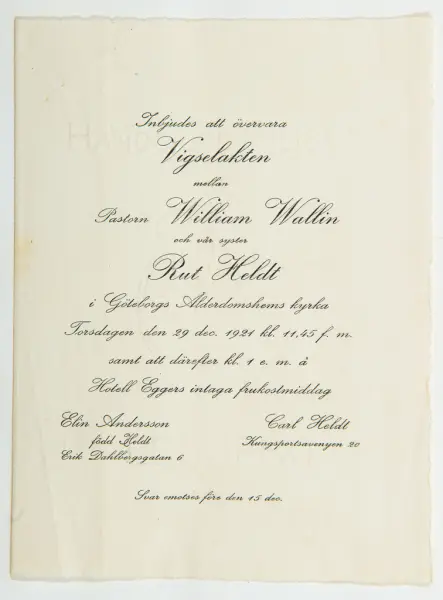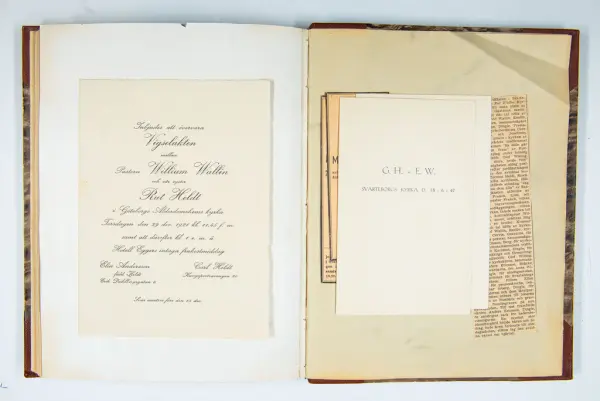 Givaren berättar: Brudgum var William Wallin, son till en tobakshandlare i Göteborg, kyrkoherde i Munkedal och sedermera kontraktsprost i Svarteborg, bruden var Ruth Heldt, dotter till en kronolänsman. Giftermålet skedde 1921, ett år senare föddes parets första barn, en dotter, mor till givaren. Det finns också några urklippta notiser och annonser om bröllopet.