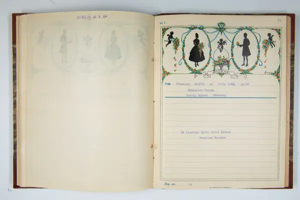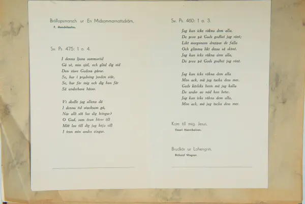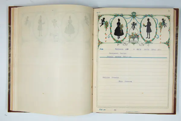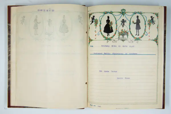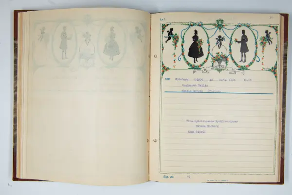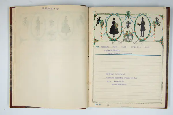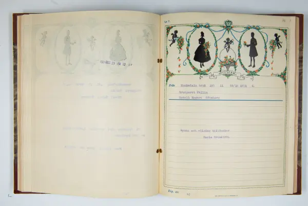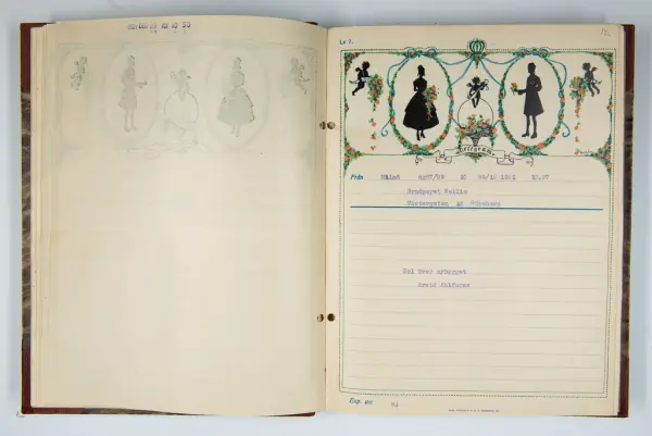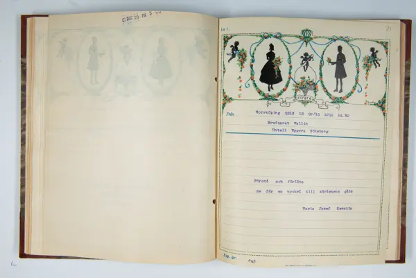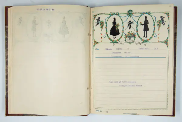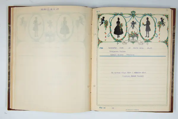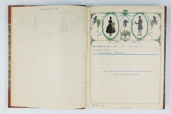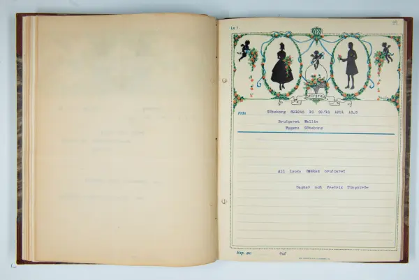 Givaren berättar: Brudgum var William Wallin, son till en tobakshandlare i Göteborg, kyrkoherde i Munkedal och sedermera kontraktsprost i Svarteborg, bruden var Ruth Heldt, dotter till en kronolänsman. Giftermålet skedde 1921, ett år senare föddes parets första barn, en dotter, mor till givaren. Det finns också några urklippta notiser och annonser om bröllopet.