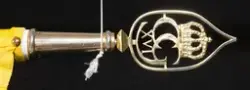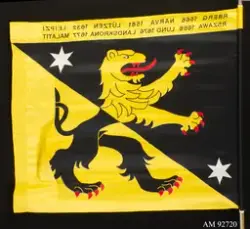 Fanan är ritad av Ingrid Lamby och tillverkad i maskinbroderi i intarsiateknik av Maj-Britt Salander/firma Blå Kusten.