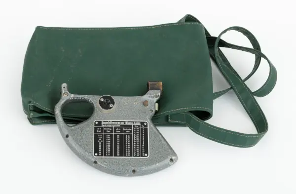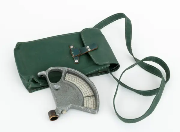 Inni veska ligger høydemåleren som i hovedsak er utført i lettmetall. Formen på instrumentet er som en litt "drøy" kvartsirkel. Instrumentet har gripehull i bakkant. Over gripehull er det montert et siktehull. I fremre kant er det montert en messingring, inne i denne ringen er det to spisse og triangulære spisser som stikker ut og peker mot hverandre. På ene siden av instrument er det montert et metallskilt med beregningsskala (antakelig tabellgrenser for avvik ved forskjellige målinger). På den andre siden er det en måleskale/avlesningsskala med en bevegelig pendel/fjær, dekt med gjenomsiktig plast.