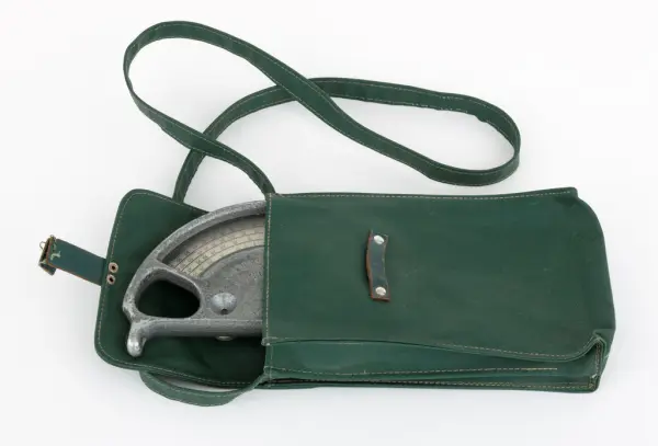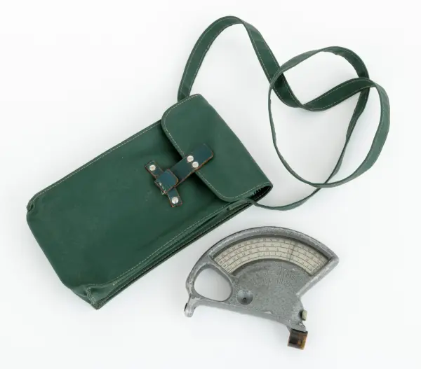 Veske med høydemåler (optisk leser) for lengdemåling av stående trær. Veska er sydd av et gummiert lerretsstoff. Den er 21,3 centimeter høy (målt langs sidekantene, uten lokk) og 13,7 centimeter bred. Innvendig er det innsydd en skillevegg, slik at den optiske avstandsmåleren kunne ligge i ett rom og linjalene i et annet. Veska har et lokk, en klaff som bøyes over toppåpningen og "låses" ved å stikke ei lærtunge sentral på lokkets ytterkant ned i en smøyestol som er fastnaglet sentralt på veskas forside. Øverst på ytterkantene er det påsydd ei 2 centimeter bred bærereim, som antakelig skulle kvile på skuldra til brukeren.