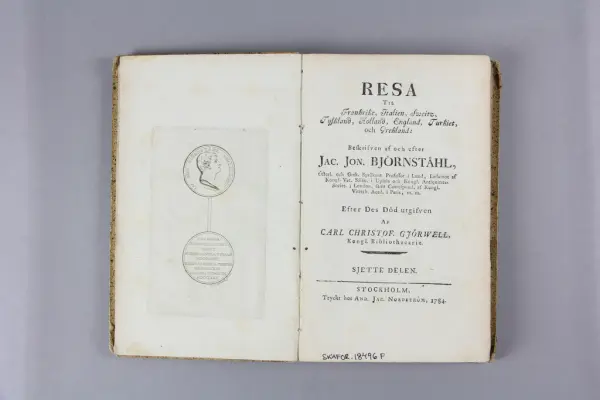 - Bokband tryckt i Sverige, 1700-tal. Inköpt på antikvariat. Införlivad i samlingarna.