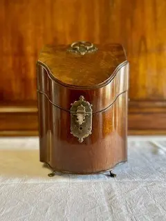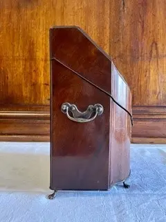 Flaskschatull fanerat med mahogny, vilande på fötter av mässing. Schatullet har ett slutande lock som möter upp i en en konvex framsida. På locket ett handtag av mässing. Raka sido...