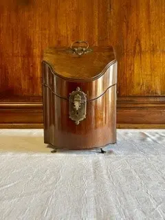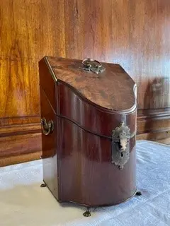 Flaskschatull fanerat med mahogny, vilande på fötter av mässing. Schatullet har ett slutande lock som möter upp i en en konvex framsida. På locket ett handtag av mässing. Raka sidor med handtag av mässing. Mitt fram en låsanordning med en profilerad bricka. Schatullets insida är uppdelad i tre fack, alla fodrad med sammet i en röd och grön nyans. Fodrets sömn är täckt med kantband i guld. Insidans fack är anpassade för tre flaskor var av två i fyrkantig modell och en i bågformad modell.