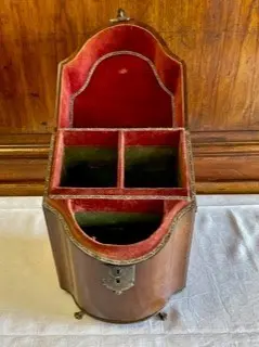 Flaskschatull fanerat med mahogny, vilande på fötter av mässing. Schatullet har ett slutande lock som möter upp i en en konvex framsida. På locket ett handtag av mässing. Raka sidor med handtag av mässing. Mitt fram en låsanordning med en profilerad bricka. Schatullets insida är uppdelad i tre fack, alla fodrad med sammet i en r... Flaskschatull fanerat med mahogny, vilande på fötter av mässing. Schatullet har ett slutande lock som möter upp i en en konvex framsida. På locket ett handtag av mässing. Raka sidor med handtag av mässing. Mitt fram en låsanordning med en profilerad bricka. Schatullets insida är uppdelad i tre fack, alla fodrad med sammet i en röd och grön nyans. Fodrets sömn är täckt med kantband i guld. Insidans fack är anpassade för tre flaskor var av två i fyrkantig modell och en i bågformad modell.