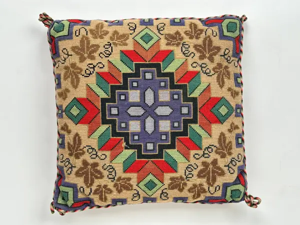 Kvadratisk stoppad soffkudde broderad med korsstygn. I mitten mönster i lila och blått, övergående i röda och gröna rombliknande block. Därefter virvlande löv i brunt och beige. Lä...