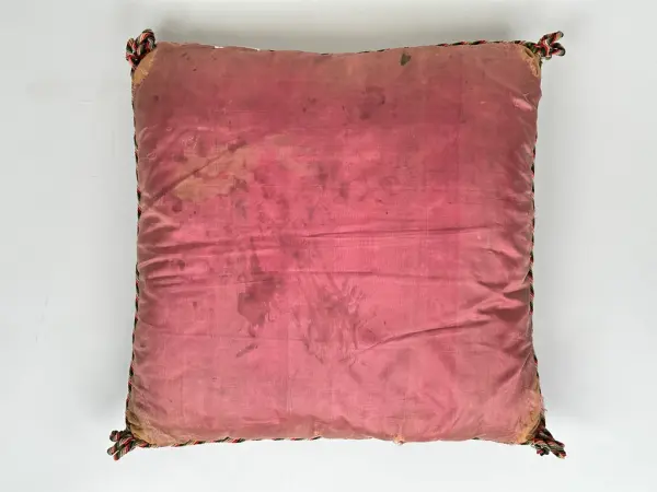 Kvadratisk stoppad soffkudde broderad med korsstygn. I mitten mönster i lila och blått, övergående i röda och gröna rombliknande block. Därefter virvlande löv i brunt och beige. Längs kanterna lila bård med kubliknande grön fyllning. I hörnen fält i lila, grönt och rött. Kantsnodd i rött, rosa och grönt, i hörnen är snodden vikt och bildar tre öglor.