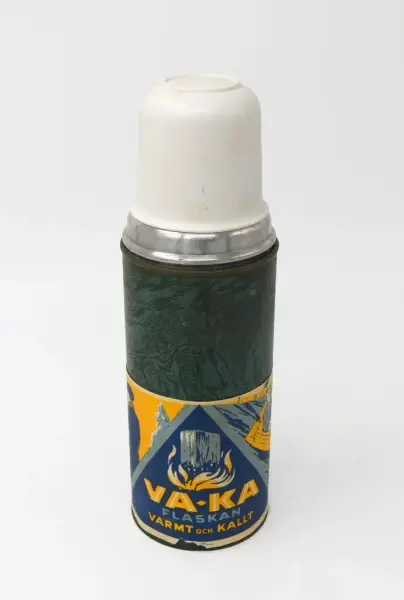 Mitten visar ett isblock med en eld under och texten: "VA-KA FLASKAN VARMT och KALLT".