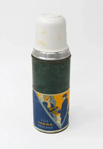 Termos inklädd i grönt marmorerat papper och vitt plastlock. Nedre delen illustrativ bred border som löper längs flaskans omkrets i färgerna gult, blått (ljus och mörk) samt vitt.