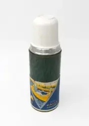 Termos inklädd i grönt marmorerat papper och vitt plastlock. Nedre delen illustrativ bred border som löper längs flaskans omkrets i färgerna gult, blått (ljus och mörk) samt vitt. ...