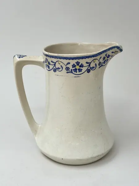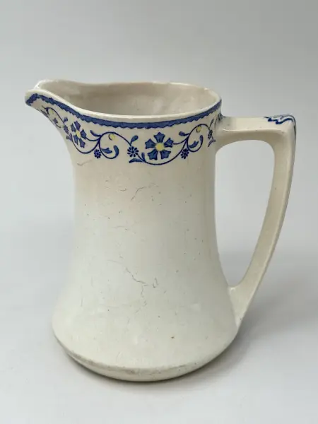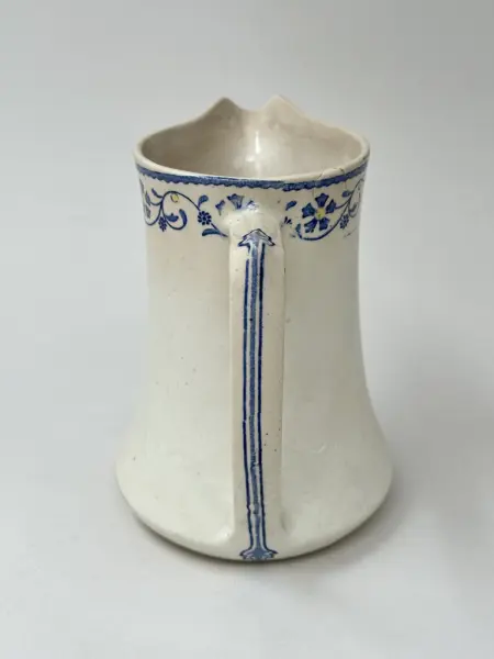 Tillbringare, fabriksgjord av krämfärgat flintgods, kromtryckt under glasyren. Modell med konkav sida, rakt handtag och pip. Dekoren i två blå toner samt gult är placerad längs överkanten som en blomsterslinga och på handtaget. Märkt i botten med blått på det vita: ankare - band med GUSTAF - band med Gustafsberg, några svårtydda stämplar i godset.