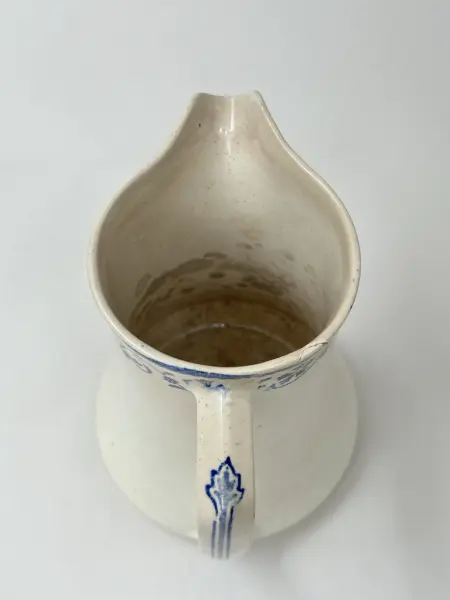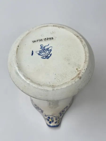 Tillbringare, fabriksgjord av krämfärgat flintgods, kromtryckt under glasyren. Modell med konkav sida, rakt handtag och pip. Dekoren i två blå toner samt gult är placerad längs överkanten som en blomsterslinga och på handtaget. Märkt i botten med blått på det vita: ankare - band med GUSTAF - band med Gustafsberg, några svårtydda...