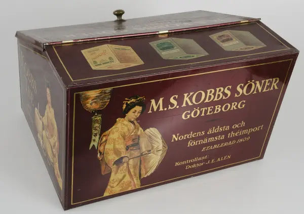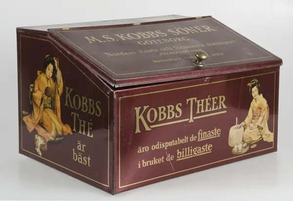 Mörkröd med text i guld "M. S. Kobbs söner Göteborg, Nordens äldsta och förnämsta theimport. Etablerad 1809, kontrollant Doktor J. E. Alén". På fram- och baksida "Kobbs theér äro odiskutabelt de finaste i bruket de billigaste". På kortsidorna "kobbs thé är bäst". Polykrom dekor. Lockets insida har en påklistrad ljusbrun papperse... Mörkröd med text i guld "M. S. Kobbs söner Göteborg, Nordens äldsta och förnämsta theimport. Etablerad 1809, kontrollant Doktor J. E. Alén". På fram- och baksida "Kobbs theér äro odiskutabelt de finaste i bruket de billigaste". På kortsidorna "kobbs thé är bäst". Polykrom dekor. Lockets insida har en påklistrad ljusbrun pappersetikett med brun text med råd om förvaring av té.