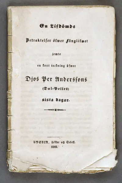 - BilagaKonceptanteckningar och skisser utförda av författaren Olof Gjerdman. Föreställer fördelningen av fångar på Uppsala slott 1849, det år då Dal-Pelle satt fängslad. Förvaras i samma kapsel som de inmärkta föremålen.