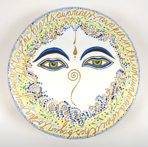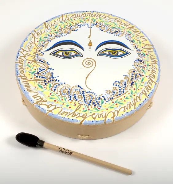 Trumman är dekorerad av givaren själv, vilket är vanligt inom New Age-tradition. Målningen är helt knuten till det buddhistiska trossystemet – texten längs kanten är ett citat ur Hjärtsutran, och ögonen i mitten är inspirerade av motiv på nepalesiska stupor. Enligt givaren symboliserar de vilande, medkännande ögonen bodhisattvaidealet inom buddhismen. Motivets syfte var att påminna henne om bodhisattvaidealet.