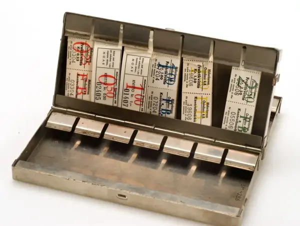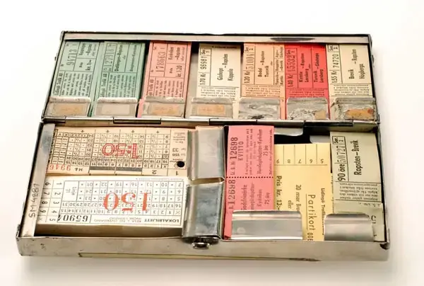 Biljettlåda från Mälaröarnas Omnibuss AB. För små blockbiljetter. Plats finns för 21 biljettblock i 3 fack. Innehåller följande biljetter: