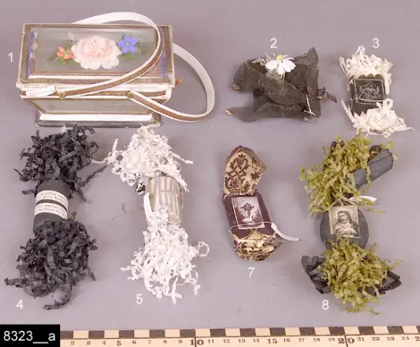 Begravningskonfektkorg med konfekter, omkring 1900.