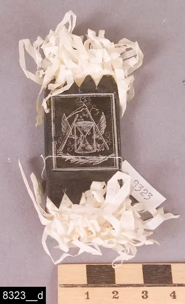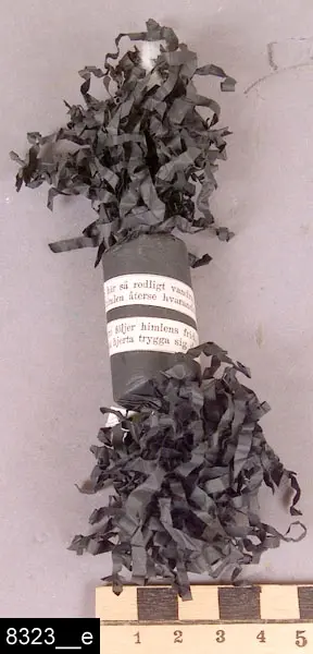 4. Begravningskaramell i svart silkespapper med frans (bild 8323__e). Runt karamellen är virat ett vitt band med två verser: "O, må vi här så redligt vandra, Att vi i himlen återse hvarandra.", "Efter tidens oro följer himlens frid, Må ditt sorgsna hjerta trygga sig dervid."