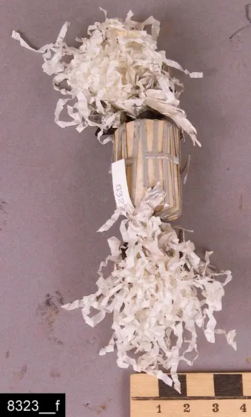 5. Begravningskaramell av vitt silkespapper med fransar i båda ändar samt med ett gallerverk av silverpapper. I båda ändar en svart rosett (bild 8323__f).