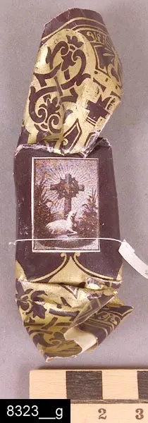 En karamell återfanns inte vid genomgången 2007. En äldre registrering har beskrivit föremålet enligt följande: "Begravningskarameller med silverpapper. På karamellen, svart krusflor samt ett gravkors i vit krita. En lila och en vit tygblomma vid korsets fot. Korset H 8,8 cm Karamellens L 8,6 cm Br 5,7 cm."