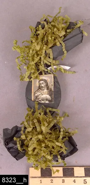 2. Begravningskaramell i svart papper med sorgflor dekorerat med en silverpappersblomma och en vit tygprästkrage (bild 8323__c). På karamellen finns en lapp med texten "Är det ej ljuft att finna ro, I grafvens tysta bo?".
