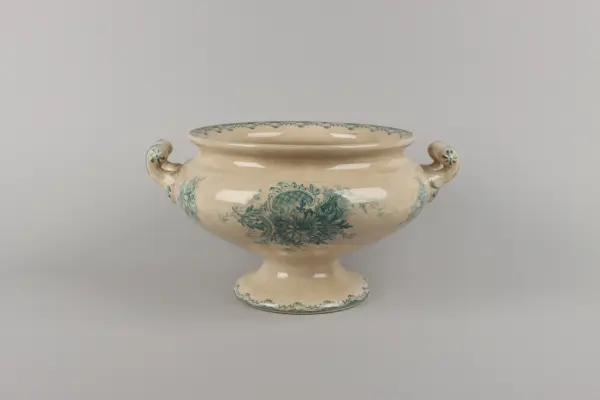 Terrinskål med en rund buktande form. Upptill ett utvikt brätte och nedtill en hög utsvängd rund fot. På skålens sidor två svängda hänklar. Brätte och fot dekorerad med bård i ett rocaill mönster. På skålens sidor sex blomstermotiv i tryckt dekor. Under foten en tryckt etikett med ett skeppsmotiv och namn" Anna Original".