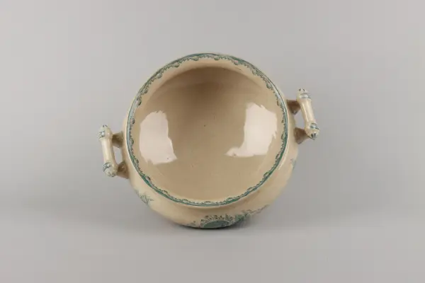 Terrinskål med en rund buktande form. Upptill ett utvikt brätte och nedtill en hög utsvängd rund fot. På skålens sidor två svängda hänklar. Brätte och fot dekorerad med bård i ett ...
