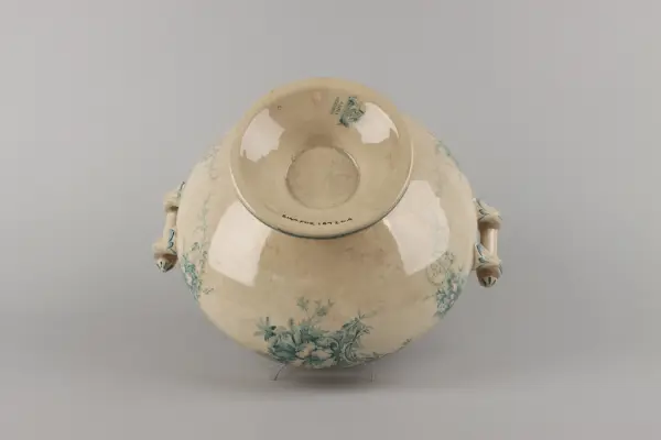 about Terrinskål med en rund buktande form. Upptill ett utvikt brätte och nedtill en hög utsvängd rund fot. På skålens sidor två svängda hänklar. Brätte och fot dekorerad med bård i ett rocaill mönster. På skålens sidor sex blomstermotiv i tryckt dekor. Under foten en tryckt etikett med ett skeppsmotiv och namn" Anna Original".