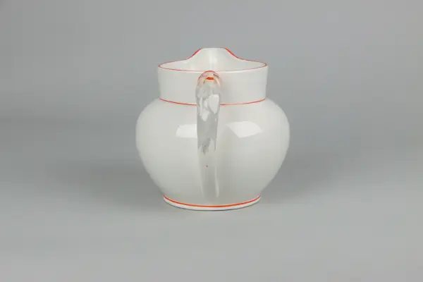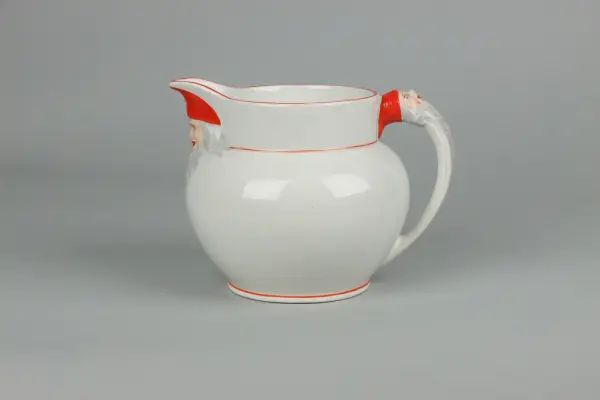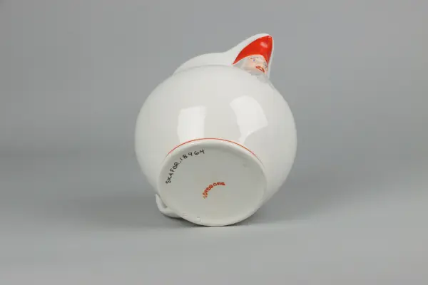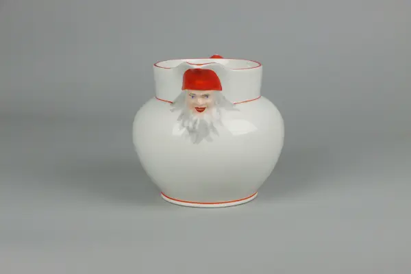 Kanna till grötservis. Rund buktande form med utvikt pip, rak krage och bågformad hänkel. Pipens fäste är format som ett tomtehuvud med ansikte, skägg och röd luva. Hänkels övre fäste även den formad som ett tomtehuvud med ansikte, skägg och röd luva. Kragens kant med röd färg. Nedanför kragen och nedtill mot foten röda smala l... Kanna till grötservis. Rund buktande form med utvikt pip, rak krage och bågformad hänkel. Pipens fäste är format som ett tomtehuvud med ansikte, skägg och röd luva. Hänkels övre fäste även den formad som ett tomtehuvud med ansikte, skägg och röd luva. Kragens kant med röd färg. Nedanför kragen och nedtill mot foten röda smala lister. Under foten bågformad fabriksstämpel i rött med namnet GÖTEBORG.
